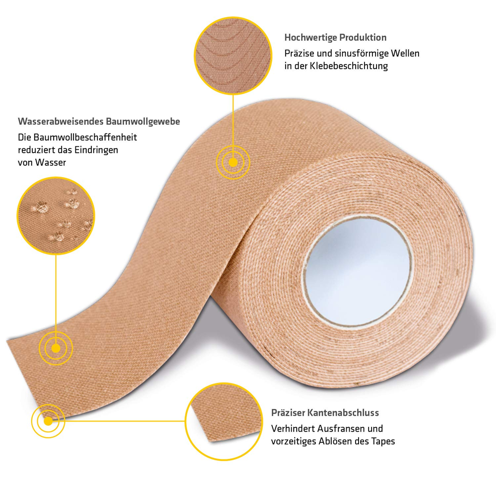 Das Tape ist wasserresistent und kann beim Duschen oder Schwitzen problemlos getragen werden. Es ist latexfrei und sehr hautfreundlich, wodurch es sich auch für empfindliche Anwender eignet.
