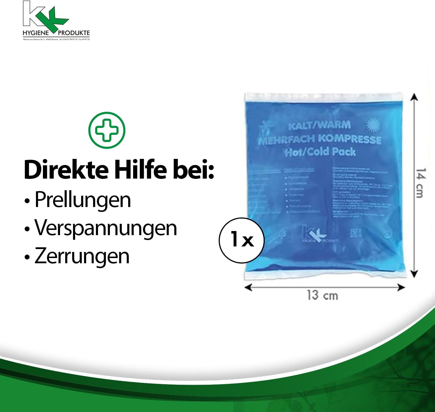 Die Kalt-Warm-Kompressen und Kältesofortkompressen können schnelle Hilfe bei Prellungen, Verstauchungen, bei Gelenkschmerzen, Fieber, Zahnschmerzen, Insektenstichen, nach Operationen und Blutergüssen bieten ! Die Kompressen sind sehr praktisch zum Mitnehmen auf Ausflügen oder Sportaktivitäten. Sie können sowohl zur Kälte- (Kühlschrank oder Truhe) als auch zur Wärmebehandlung (Mikrowelle) angewendet werden.