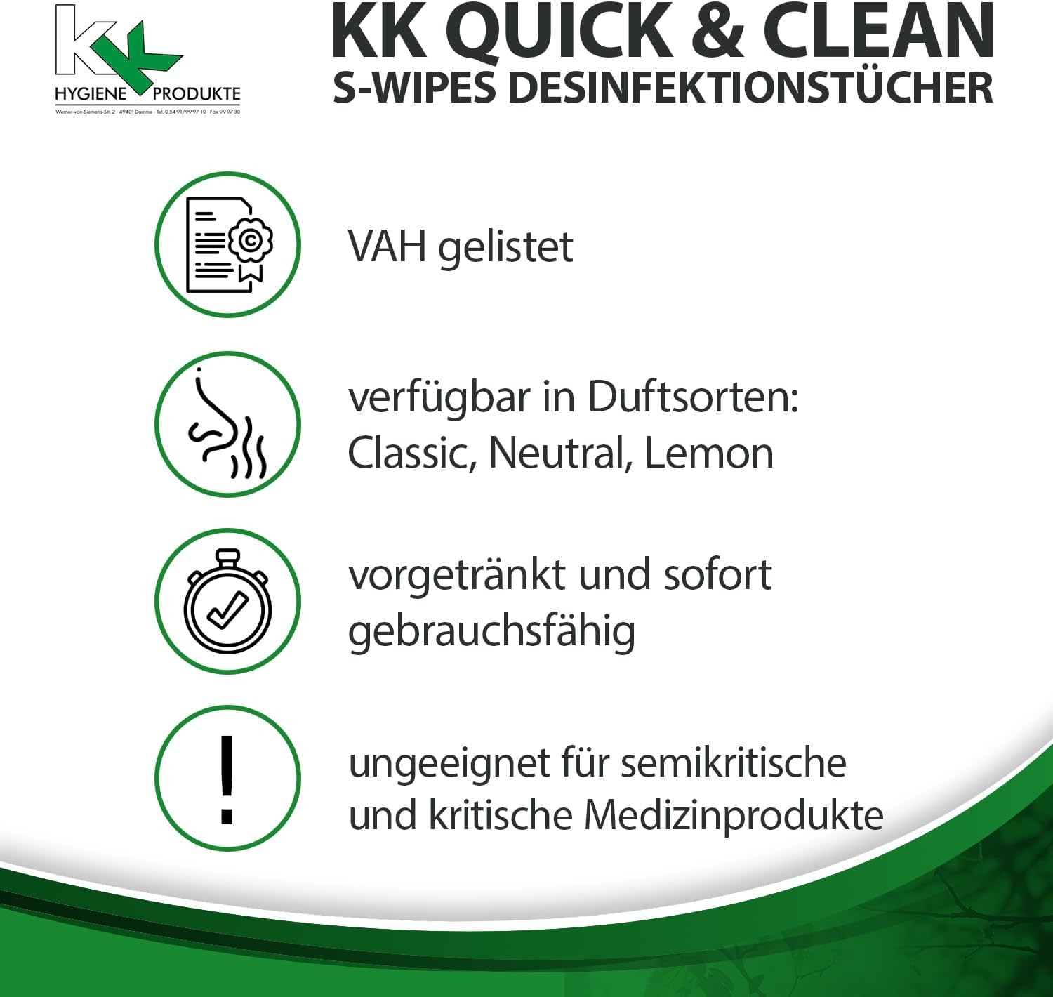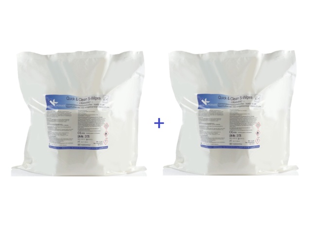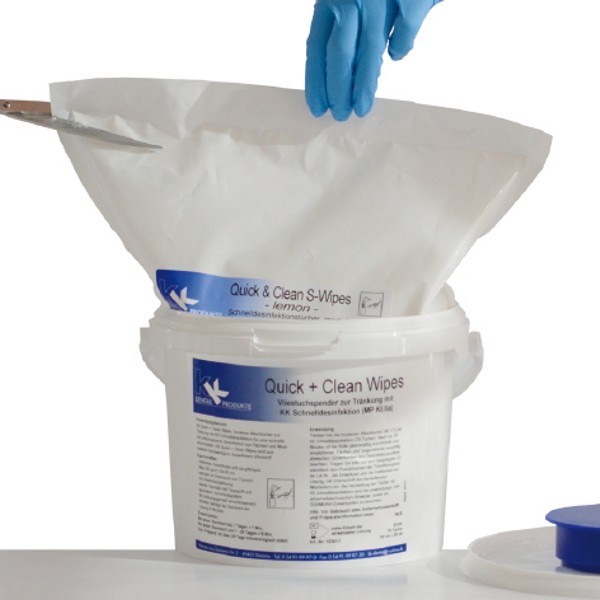 sind gebrauchsfertige, alkoholisch getränkte Desinfektionstücher im Nachfüllbeutel zum Einsatz mit Spendereimer. Die Desinfektionstücher sind mit KK Schnelldesinfektion (auf Alkohol- und QUAT-Basis) vorgetränkt und können nach Einsetzen in den Spendereimer direkt verwendet werden. KK Quick & Clean S-Wipes bieten eine universelle und zeitsparende Anwendung.