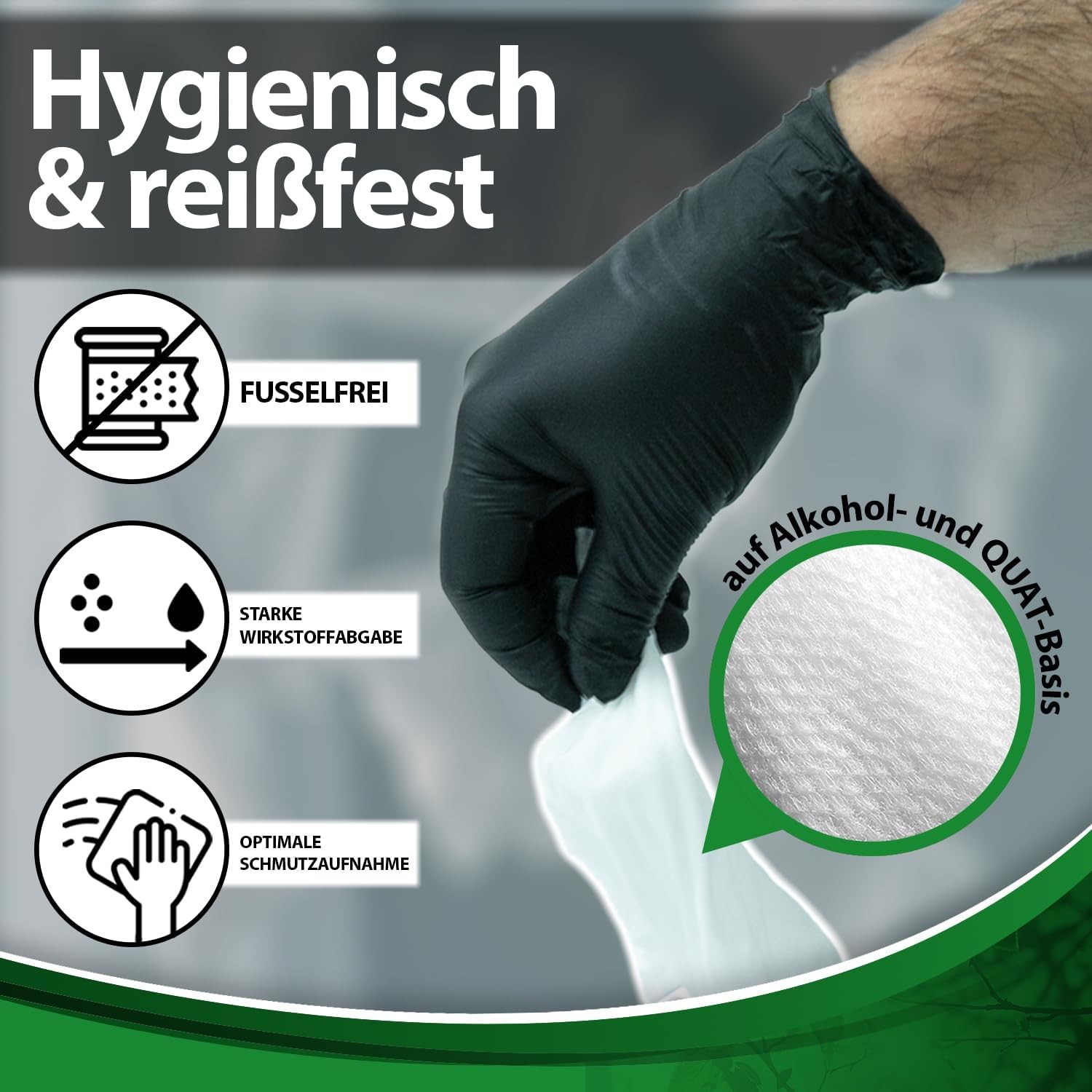 Die getränkten Tücher sind von der bekannten Quaität, fusselfrei, reißfest und durch ihre starke Aufnahmefähigkeit können große Flächen problemlos desinfiziert werden. Optimale Wirkstoffabgabe bei gleichzeitiger hervorragender Schmutzaufnahme.