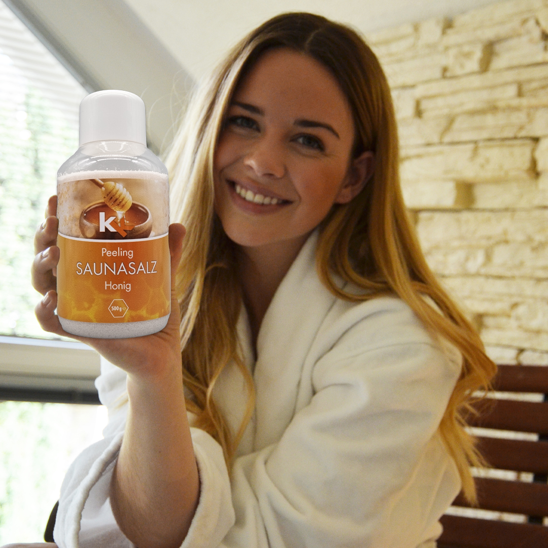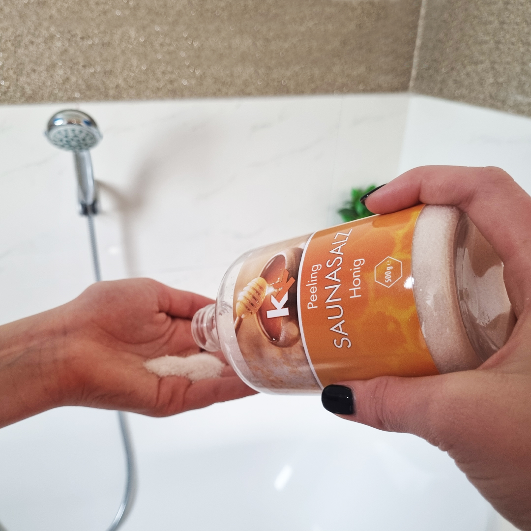 1. Pflege für die Haut: KK Saunasalz (Peeling) vereint die reinigende Wirkung von Salz mit den pflegenden Eigenschaften von Honig. Die groben Salzkristalle entfernen sanft abgestorbene Hautzellen, während der Honig die Haut mit Feuchtigkeit versorgt und sie geschmeidig macht.