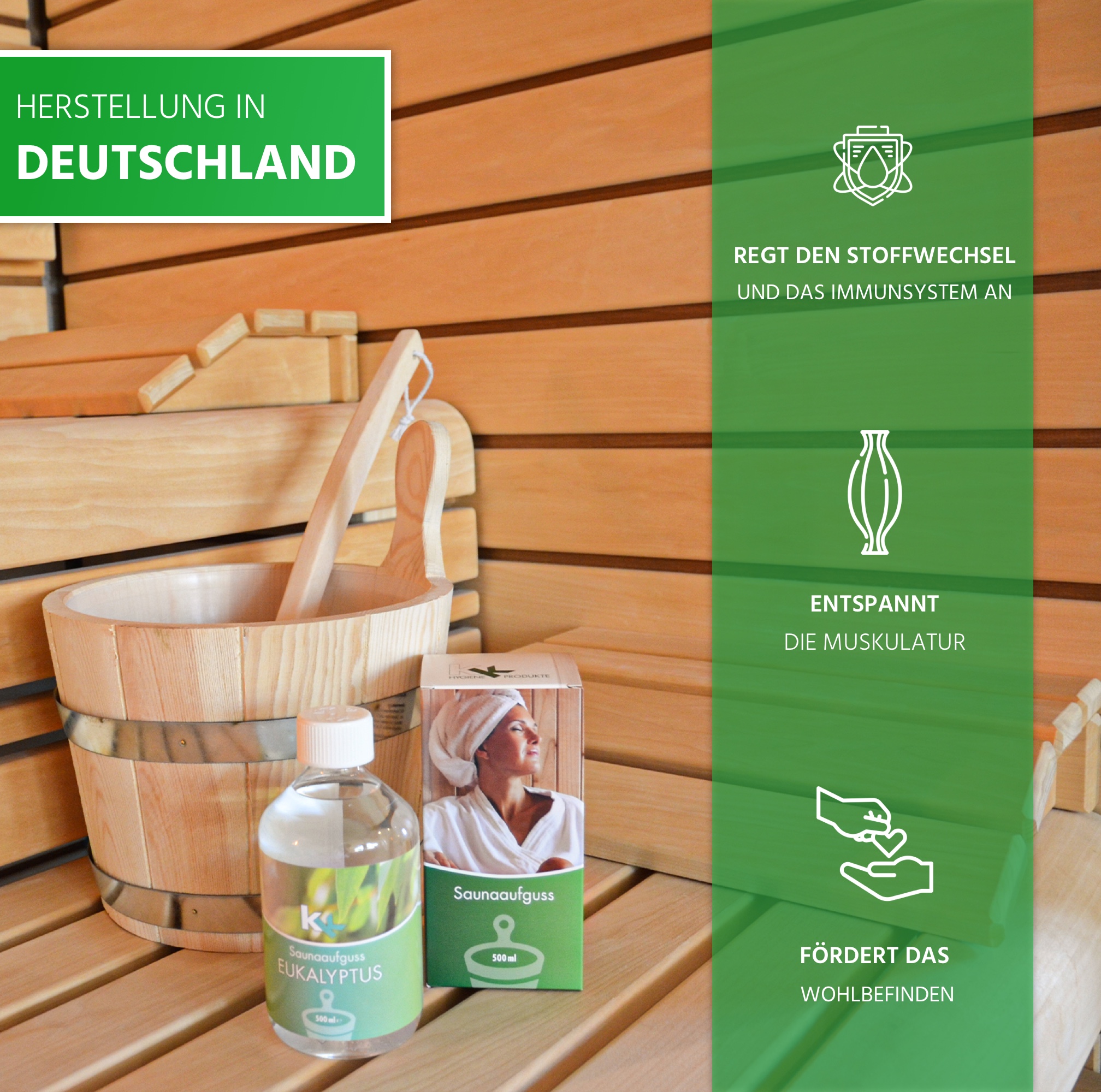 Wohltuende Wärme die den Körper umgibt und verschiedene Düfte die die Sinne anregen. Die Abfolge von Hitze mit anschließendem Kaltbad entspannt die Muskulatur und hat neben physiologischen Effekten wie der Anregung des Kreislaufs, des Stoffwechsels, des Immunsystems und der Atmung vor allem auch eine wohltuende Auswirkung auf das allgemeine Wohlbefinden. Die KK Saunapräparate unterstützen dies noch zusätzlich.