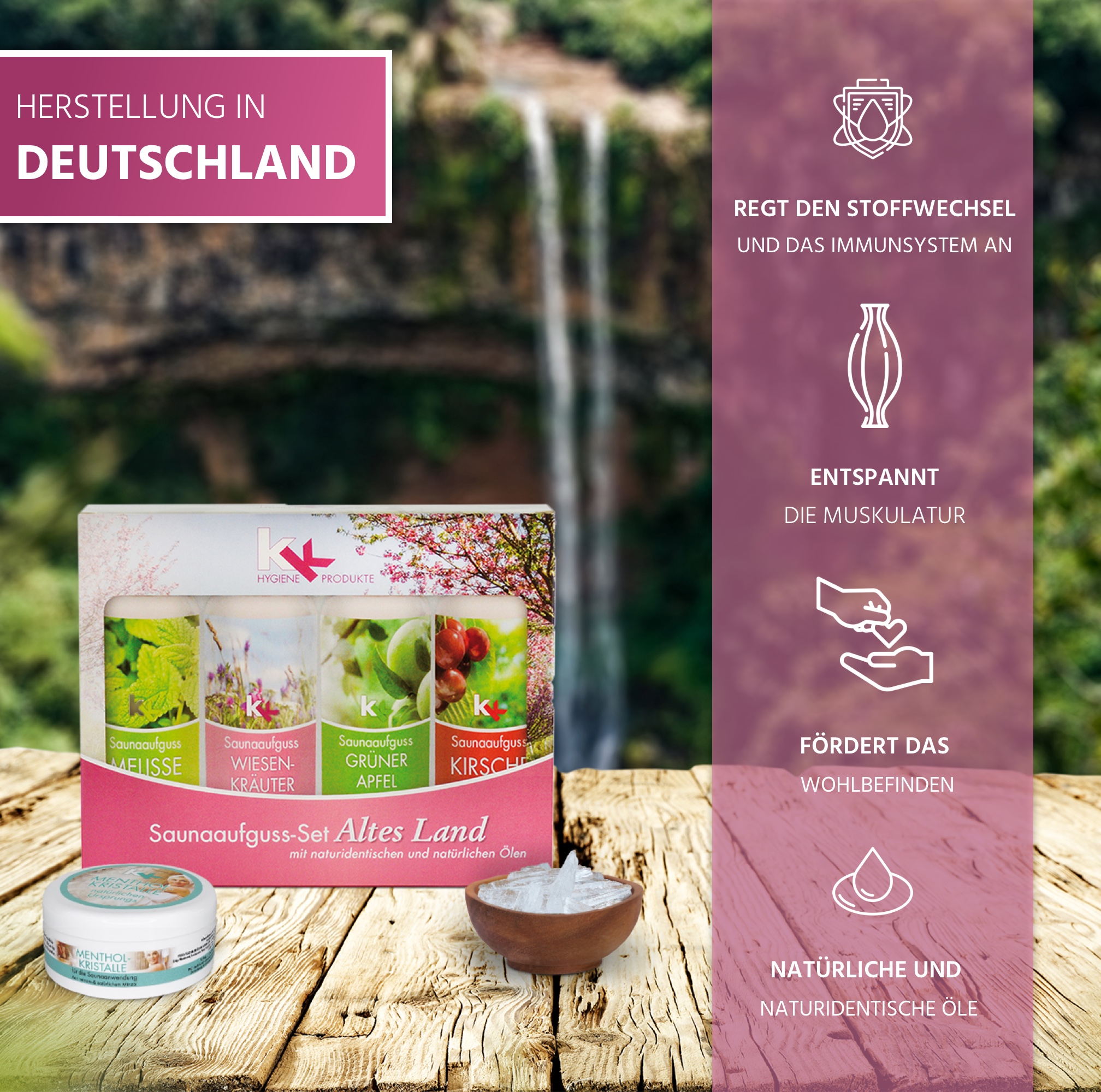 Regelmäßige Saunagänge wirken positiv auf den gesamten Organismus. Sauna ist ein Schwitzbad, welches man in verschiedenen Formen nutzen kann, z.B. gibt es die finnische Sauna, das Dampfbad und das Warmluftbad etc. Wohltuende Wärme, die den Körper umgibt und verschiedene Düfte, die die Sinne anregen. Die Abfolge von Hitze mit anschließendem Kaltbad entspannt die Muskulatur und hat neben physiologischen Effekten, wie der Anregung des Kreislaufs, des Stoffwechsels, des Immunsystems und der Atmung, vor allem auch eine wohltuende Auswirkung auf das allgemeine Wohlbefinden. Die KK Sauna-Düfte, angereichert mit natürlichen ätherischen Ölen, unterstützen diese Wirkung zusätzlich.