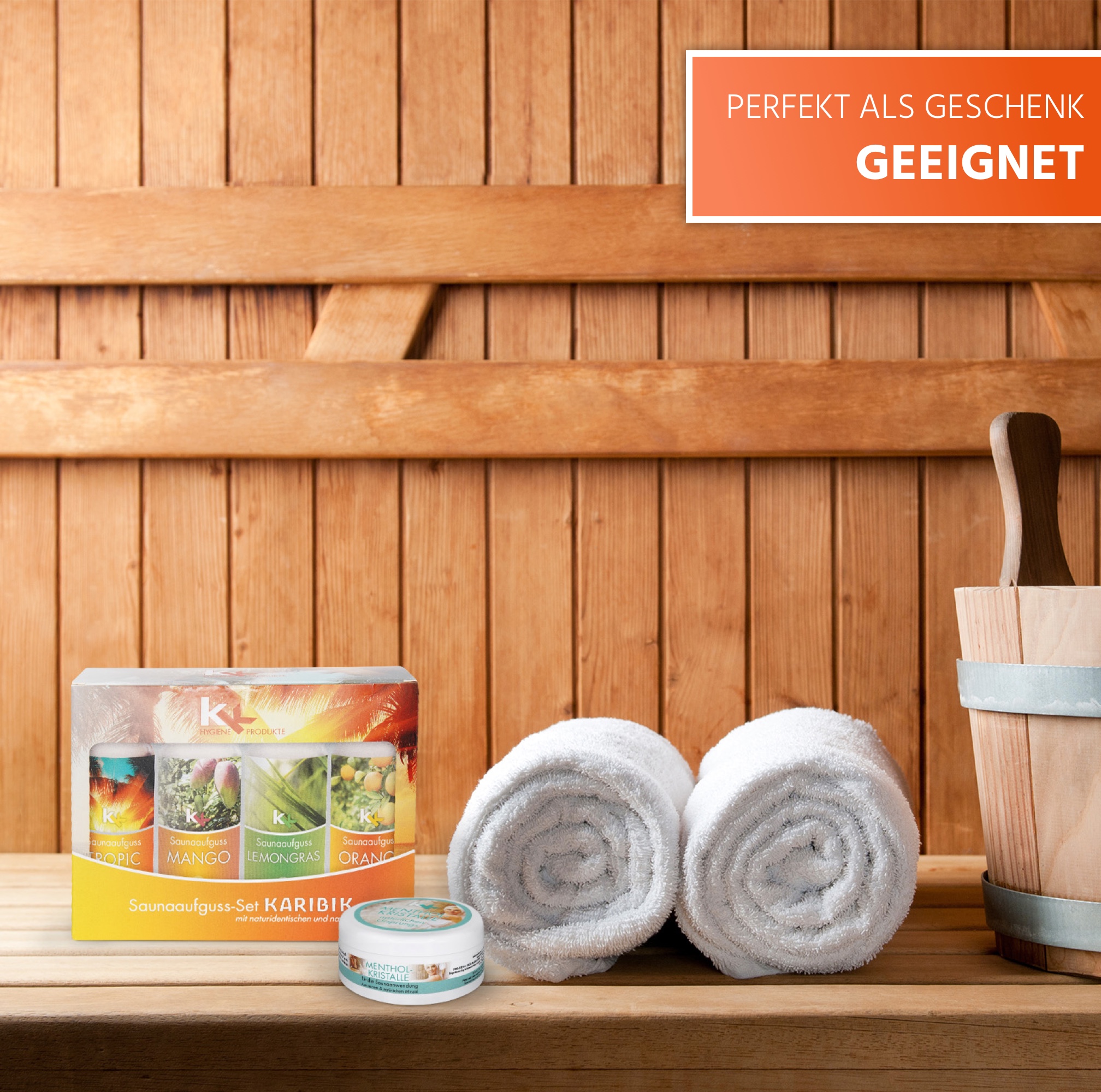 Regelmäßige Saunagänge wirken positiv auf den gesamten Organismus. Sauna ist ein Schwitzbad, welches man in verschiedenen Formen nutzen kann, z.B. gibt es die finnische Sauna, das Dampfbad und das Warmluftbad etc. Wohltuende Wärme, die den Körper umgibt und verschiedene Düfte, die die Sinne anregen. Die Abfolge von Hitze mit anschließendem Kaltbad entspannt die Muskulatur und hat neben physiologischen Effekten, wie der Anregung des Kreislaufs, des Stoffwechsels, des Immunsystems und der Atmung, vor allem auch eine wohltuende Auswirkung auf das allgemeine Wohlbefinden. Die KK Sauna-Düfte, angereichert mit natürlichen ätherischen Ölen, unterstützen diese Wirkung zusätzlich.