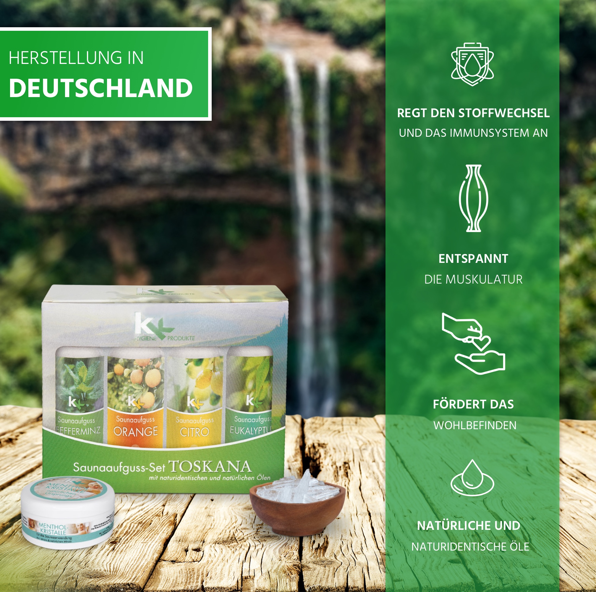 Regelmäßige Saunagänge wirken positiv auf den gesamten Organismus. Sauna ist ein Schwitzbad, welches man in verschiedenen Formen nutzen kann, z.B. gibt es die finnische Sauna, das Dampfbad und das Warmluftbad etc. Wohltuende Wärme, die den Körper umgibt und verschiedene Düfte, die die Sinne anregen. Die Abfolge von Hitze mit anschließendem Kaltbad entspannt die Muskulatur und hat neben physiologischen Effekten, wie der Anregung des Kreislaufs, des Stoffwechsels, des Immunsystems und der Atmung, vor allem auch eine wohltuende Auswirkung auf das allgemeine Wohlbefinden. Die KK Sauna-Düfte, angereichert mit natürlichen ätherischen Ölen, unterstützen diese Wirkung zusätzlich.