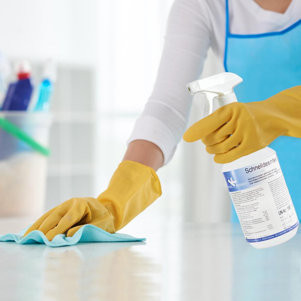 Anschließend die Fläche desinfizieren. Bitte beachten Sie, dass die Flächendesinfektion die Reinigung der Fläche nicht ersetzt.