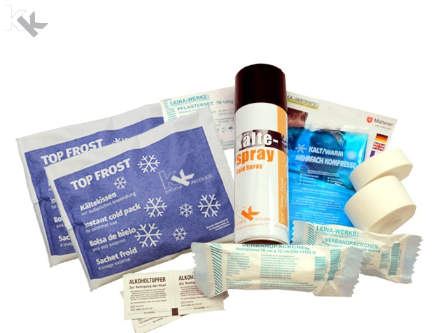 Die Sportbetreuertasche von KK Hygiene, befüllt mit qualitativ hochwertigen Produkten, ermöglicht eine schnelle und professionelle Erstversorgung kleinerer Sportverletzungen und ist daher der ideale Begleiter im Mannschaftssport.