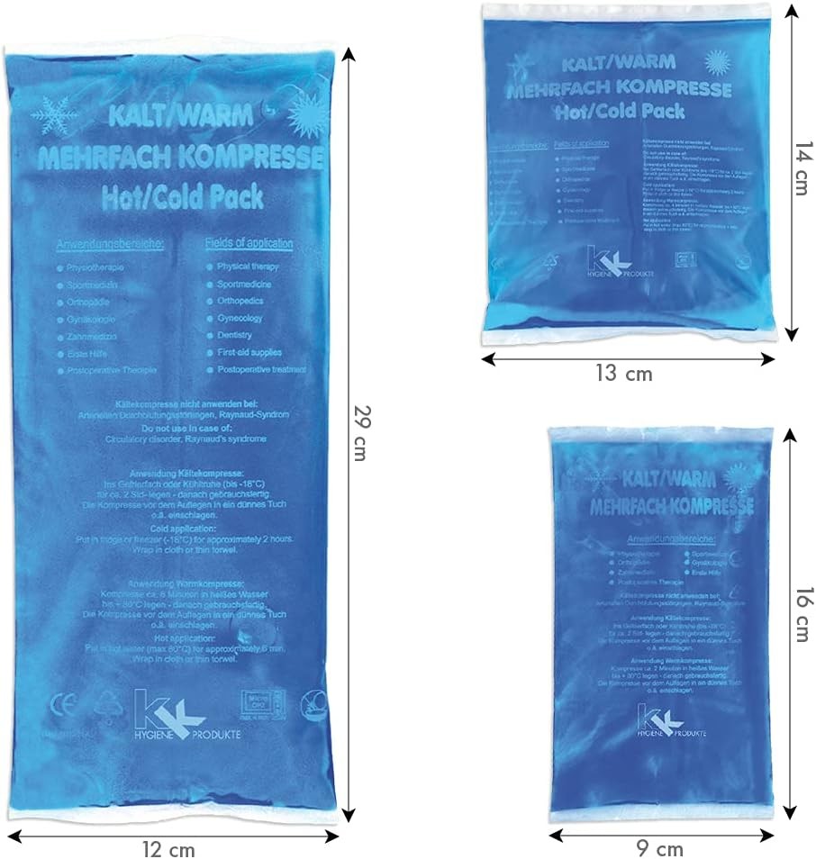 Die Kalt-Warm-Kompressen können schnelle Hilfe bei Prellungen, Verstauchungen, bei Gelenkschmerzen, Fieber, Zahnschmerzen, Insektenstichen, nach Operationen und Blutergüssen bieten ! Die Kompressen sind sehr praktisch zum Mitnehmen auf Ausflügen oder Sportaktivitäten. Sie können sowohl zur Kälte- (Kühlschrank oder Truhe) als auch zur Wärmebehandlung (Mikrowelle) angewendet werden.
