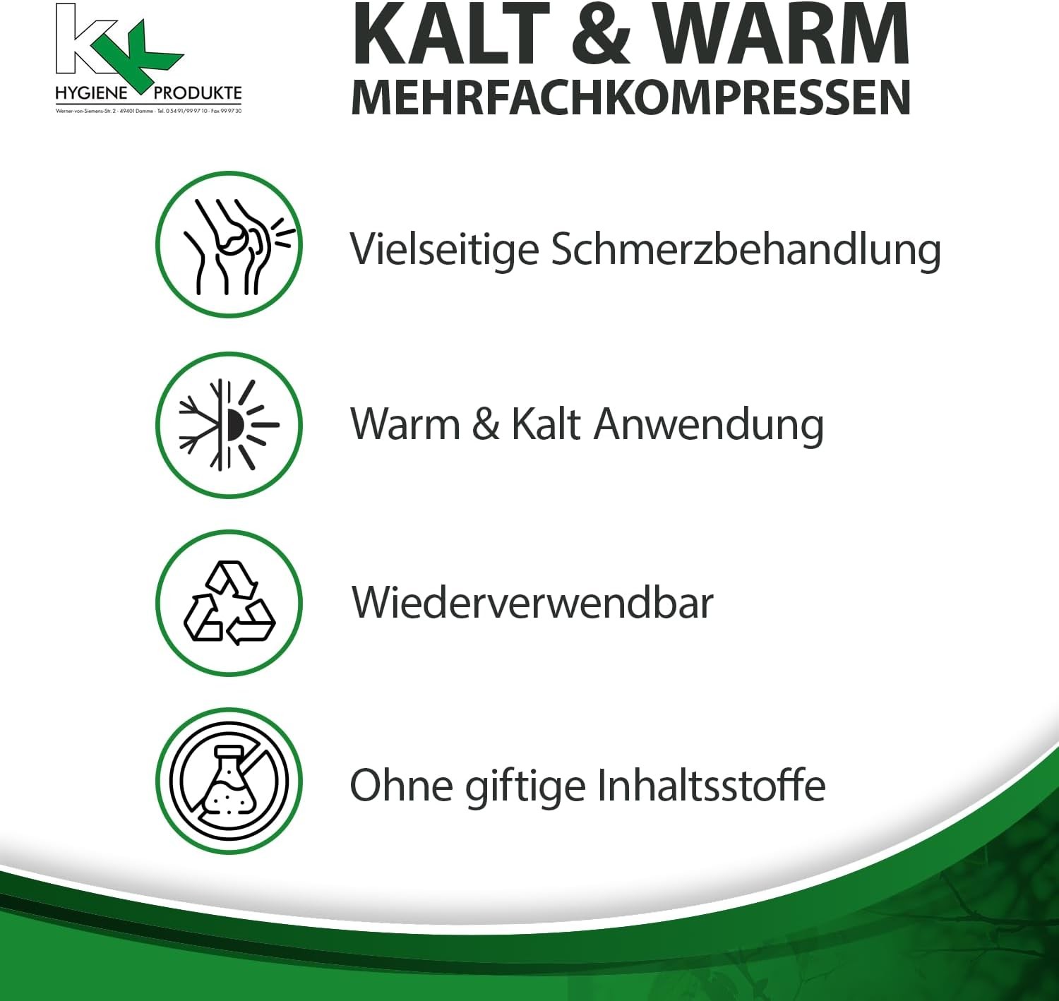 Kalt-Warm-Kompressen sind vielseitige medizinische Hilfsmittel zur Schmerzlinderung und Entzündungsreduktion. Sie können entweder gekühlt oder erwärmt angewendet werden, je nach Bedarf. Die Kälte hilft, Schwellungen zu reduzieren und akute Verletzungen zu behandeln, während die Wärme Muskelverspannungen löst und chronische Schmerzen lindert. Die Kompressen sind einfach anzuwenden, passen sich gut an den Körper an und sind wiederverwendbar.