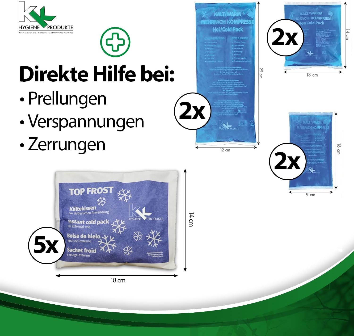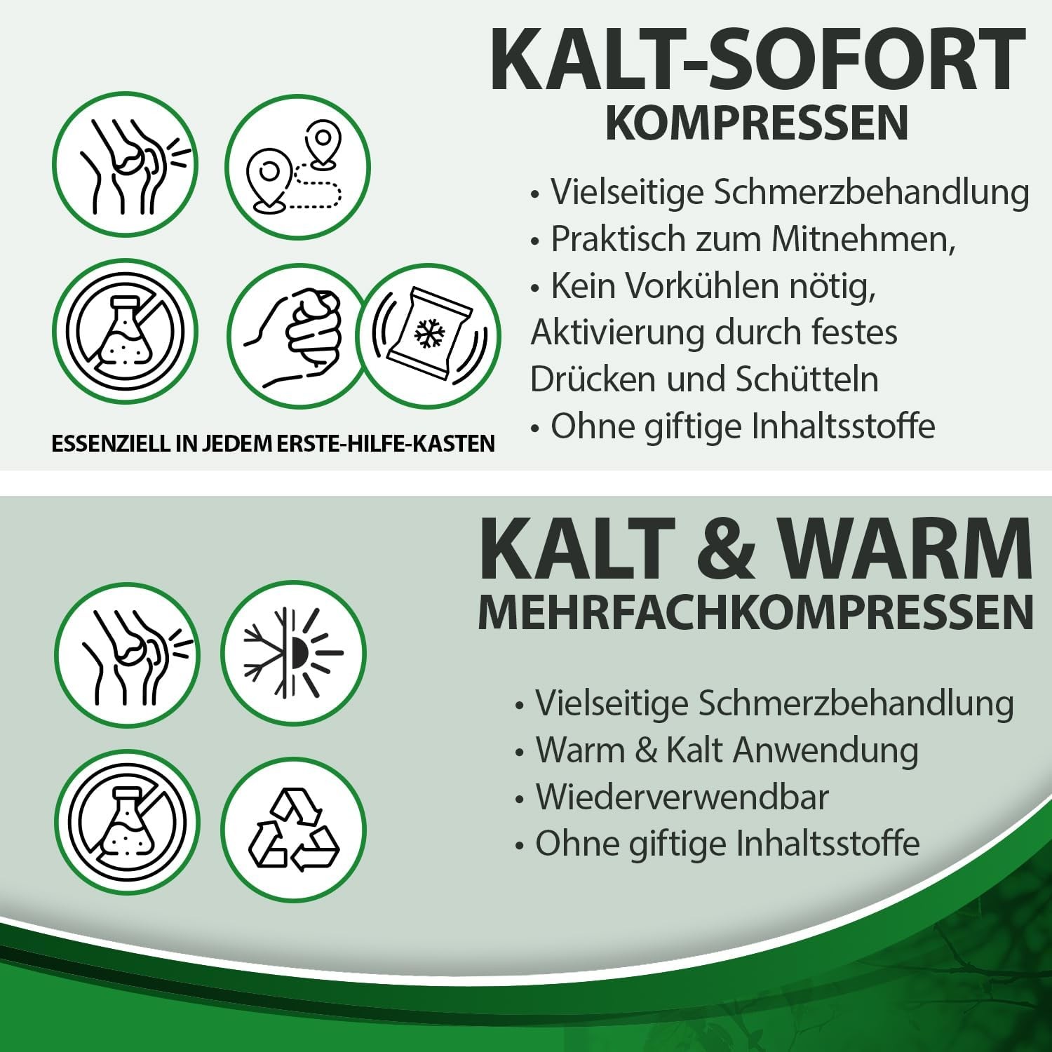 Die Kalt-Warm-Kompressen und Kältesofortkompressen können schnelle Hilfe bei Prellungen, Verstauchungen, bei Gelenkschmerzen, Fieber, Zahnschmerzen, Insektenstichen, nach Operationen und Blutergüssen bieten ! Die Kompressen sind sehr praktisch zum Mitnehmen auf Ausflügen oder Sportaktivitäten. Sie können sowohl zur Kälte- (Kühlschrank oder Truhe) als auch zur Wärmebehandlung (Mikrowelle) angewendet werden.