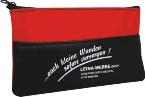 Die Leina Mini-Verbandtasche aus wasserabweisendem Nylongewebe und kleiner Kunstledervortasche, beides mit Reißverschluss, hat rückseitig 2 Gürtelschlaufen aus Klettverschluss zum Befestigen z.B. an Fahrradlenker, Hosengürtel, etc. Wichtig für die Erstversorgung bei Unfällen und Verletzungen im Haushalt und auch ideal für unterwegs!