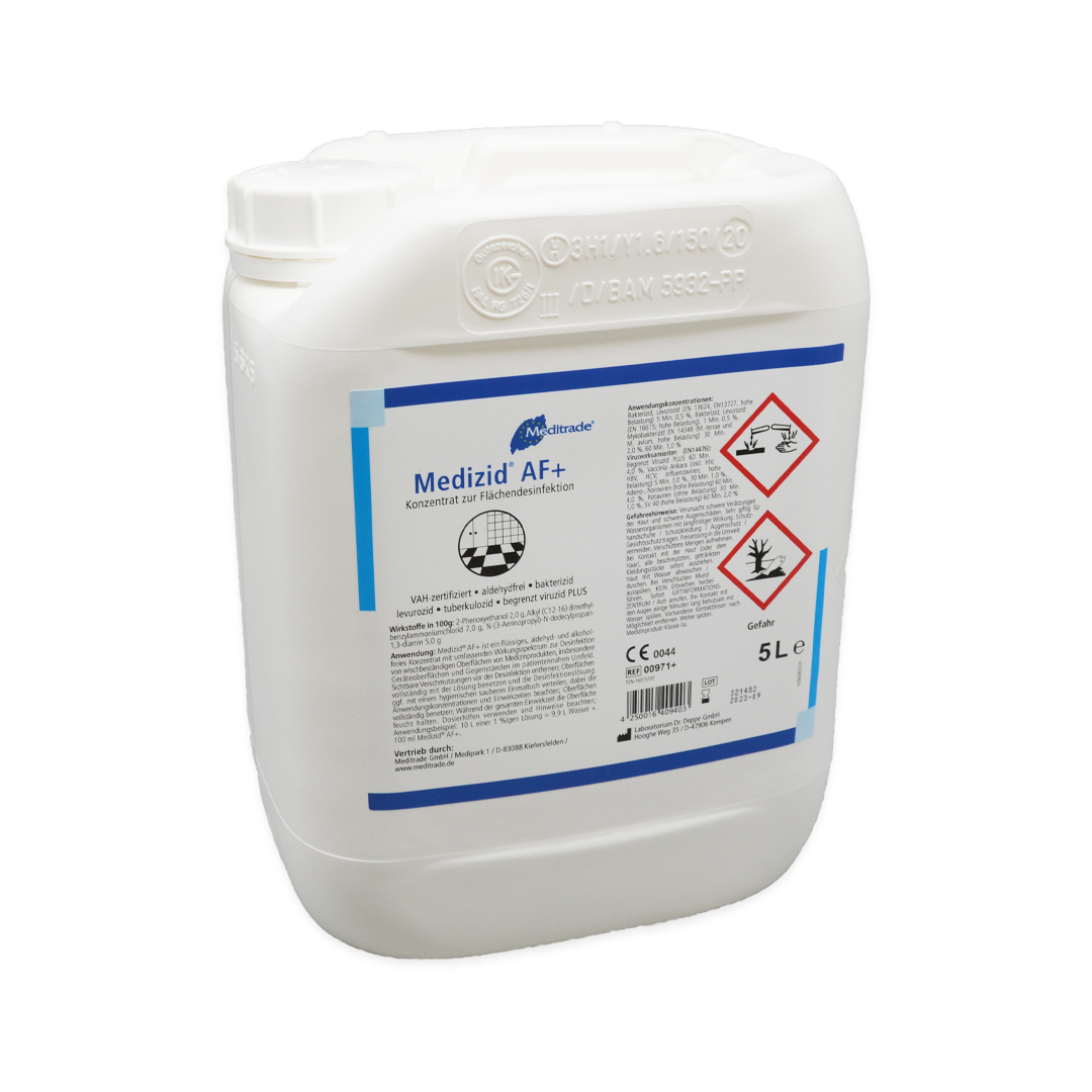 Medizid® AF+ ist ein flüssiges, aldehyd- und alkoholfreies Konzentrat mit umfassenden Wirkungsspektrum zur Desinfektion von wischbeständigen Oberflächen von Medizinprodukten, insbesondere Geräteoberflächen und Gegenständen im patientennahen Umfeld. Sichtbare Verschmutzungen vor der Desinfektion entfernen; Oberflächen vollständig mit der Lösung benetzen und die Desinfektionslösung ggf. mit einem hygienischen sauberen Einmaltuch verteilen, dabei die Anwendungskonzentrationen und Enwirkzeiten beachten; Während der gesamten Einwirkzeit die Oberfläche feucht halten. Dosierhilfen verwenden und Hinweise beachten; Anwendungsbeispiel: 10 L einer 1%igen Lösung = 9,9 L Wasser + 100 ml Medizid® AF+.