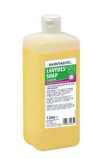 Die Cremeseife wird in die zuvor angefeuchteten Hände dosiert und verrieben. Mit klarem Wasser abspülen. Eine tropfengroße Menge der Cremeseife ist für eine Anwendung ausreichend. Die Kontaktzeit der LAVYDES SOAP zum Erreichen der bakteriziden Wirkung gemäß DIN EN 13727 bträgt 1 Minute. Die Dosierung erfolgt mit handelsüblichen Seifenspendern.