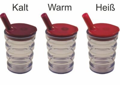 Der Rillenbecher mit 200 ml Fassungsvermögen erleichtert bettlägerigen Patienten das Trinken im Liegen und ist eine Trinkhilfe für Menschen, die durch eine Einschränkung gewöhnliche Trinkgefäße nicht benutzen können. Er hat einen Deckel, der die Farbe je nach Temperatur ändert. Durch ein Ventil im Deckel ist er nahezu auslaufsicher. Vertiefungen im Becher ermöglichen einen festen Halt beim Trinken. Er besteht aus bruchsicherem Kunststoff, ist spülmaschinenfest und mikrowellengeeignet. Der Becher ist eine hervorragende Alltagshilfe in Alten- und Pflegeheimen, Krankenhäuser oder zur häuslichen Krankenpflege.