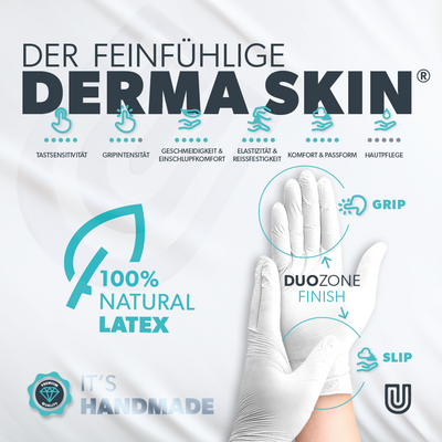 Die Unigloves DERMA SKIN Latexhandschuhe sind die ideale Wahl für alle, die Wert auf Flexibilität, Sicherheit und hervorragende Haptik legen.
