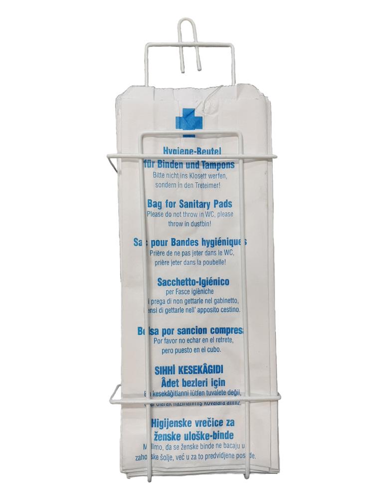 Hygienebeutelspender aus einem weißen Drahtgeflecht.
